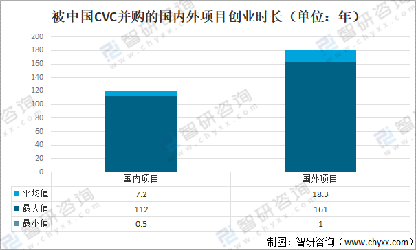 國內(nèi)項(xiàng)目被CVC并購的項(xiàng)目平均創(chuàng)業(yè)時長最小為0.5年,最大為112年,平均值為7.2年;國外項(xiàng)目被CVC并購的項(xiàng)目平均創(chuàng)業(yè)時長最小為1年,最大為116年,平均值為18.3年。