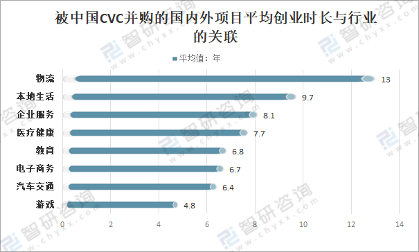在被中國CVC并購的國內(nèi)外項(xiàng)目平均創(chuàng)業(yè)時長來看,游戲項(xiàng)目是屬于“短平快”,在被中國CVC并購的國內(nèi)外項(xiàng)目平均創(chuàng)業(yè)時長平均值僅為4.8年;最長的是物流行業(yè),在被中國CVC并購的國內(nèi)外項(xiàng)目平均創(chuàng)業(yè)時長平均值13年.