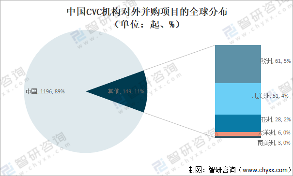截止2021年8月30日,中國CVC機(jī)構(gòu)對外并購項(xiàng)目在國內(nèi)發(fā)生1196起,占了89%;在國外發(fā)生149起,僅占11%,其中在歐洲發(fā)生61起,占5%;北美洲發(fā)生51,占4%;亞洲發(fā)生28,占2%;大洋洲發(fā)生6;南美洲發(fā)生3。