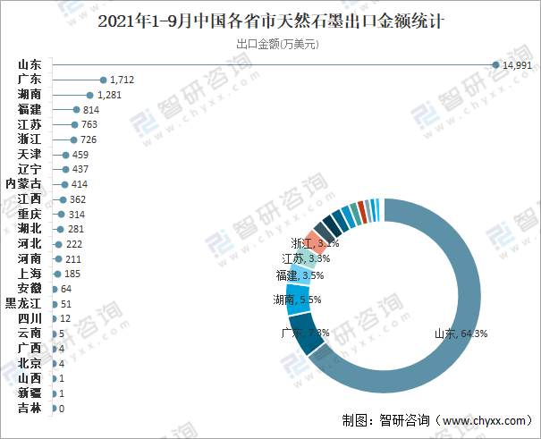 2021年1-9月中國各省市天然石墨出口金額統計(萬美元)