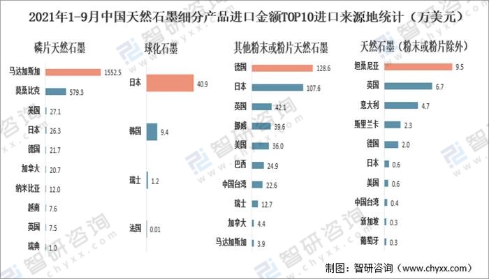 從進口來源地來看,2021年1-9月中國磷片天然石墨主要從馬達加斯加和莫桑比克進口,進口金額分別為1552.5萬美元和579.3萬美元;球化石墨主要從日本進口,進口金額為40.9萬美元;其他粉末或粉片天然石墨主要從德國和日本進口,進口金額分別為128.6萬美元和107.6萬美元;天然石墨(粉末或粉片除外)主要從坦桑尼亞和英國進口,進口金額分別為9.5萬美元和6.7萬美元。