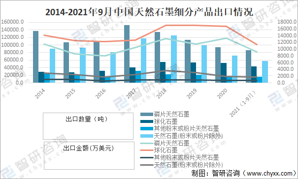 2014-2021年9月中國天然石墨細分產品出口情況