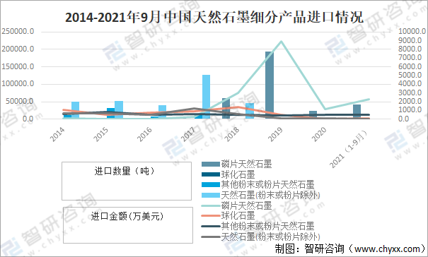 2014-2021年9月中國天然石墨細分產品進口情況