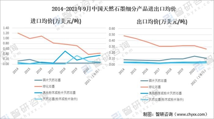 2014-2021年9月中國天然石墨細分產品進出口均價