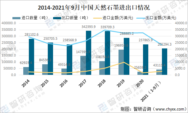 2014-2021年9月中國天然石墨進出口情況
