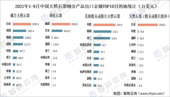 2021年1-9月中國天然石墨細分產品出口金額TOP10目的地統計(萬美元)