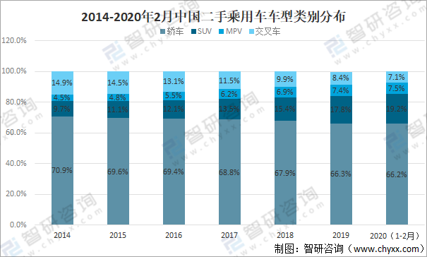 2014-2020年2月中國二手乘用車車型類別分布