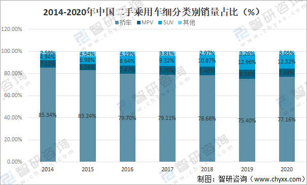 2014-2020年中國二手乘用車細分類別銷量占比(%)