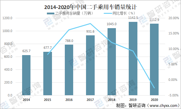 隨著我國乘用車市場的高速發展,二手車市場也隨之逐漸成長起來,近年來受政策刺激、市場引導、消費者觀念轉變等多重因素影響,中國二手乘用車銷量快速增長,2019年中國二手乘用車銷量達1142.5萬輛,較2018年增加了97.50萬輛,同比增長9.33%,2020年較2019年有所下滑,2020年中國二手乘用車銷量為1112.9萬輛,較2019年減少了29.60萬輛,同比減少2.59%。