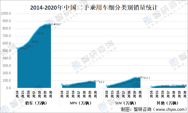 2014-2020年中國二手乘用車細分類別銷量統計(萬輛)