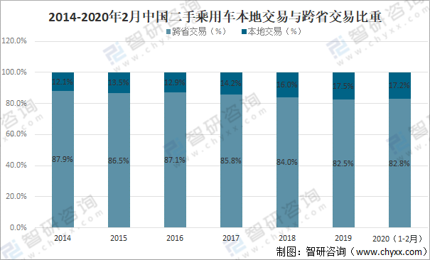 2014-2020年2月中國二手乘用車本地交易與跨省交易比重