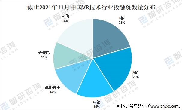 從VR技術行業投融資數量分布來看,B輪、A輪占比均超20%,占比分別為21%、20%;其次A+輪、戰略投資、天使輪分別占比16%、14%、11%。