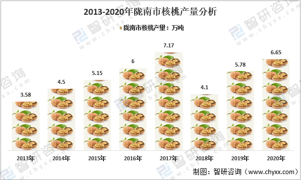 隴南市位于甘肅省東南部, 地處秦巴山區, 東接陜西, 南通四川, 扼陜甘川 3 省要沖, 素有 “秦隴鎖鑰, 巴蜀咽喉” 之稱。 隴南核桃栽培歷史悠久, 是秦巴山區核桃最佳適生地之一。核桃產業是目前隴南覆蓋面最廣、 涉及農戶最多的特色經濟林產業。歷屆隴南市委、 政府都把核桃產業作為富民支柱產業來抓, 因地制宜, 堅持走品種化栽培、 園藝化管理、 規模化生產、 產業化經營的路子, 行政推動, 示范帶動, 市場驅動, 多措并舉, 在基地建設、 品種改良、 科技支撐、 產品加工、 電子商務等方面取得了突破性進展。根據數據統計顯示,2017年甘肅隴南核桃產量達7.17萬噸,為2013-2020年間最高,2018年四月初的低溫霜凍災害天氣,對隴南市的林果業造成很大影響,產量下滑至4.1萬噸,2020年隴南縣核桃產量6.65萬噸,占甘肅省核桃總產量的51.79%。