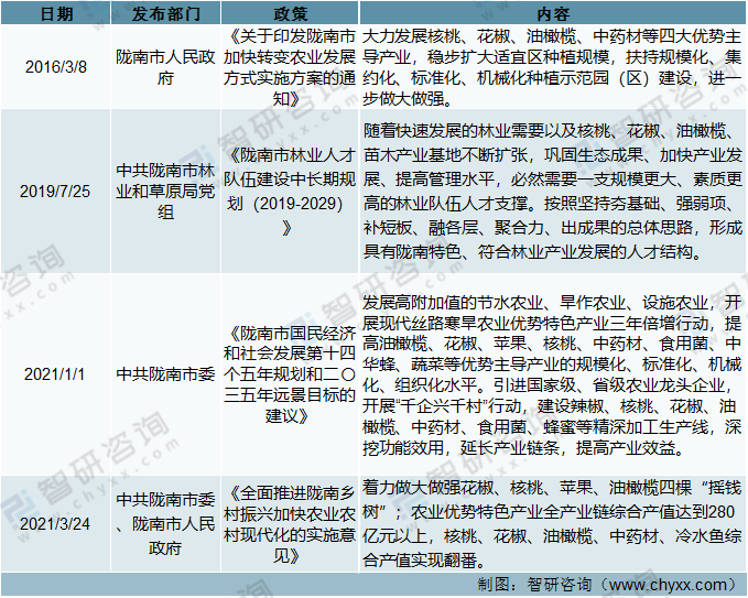 近年來,隴南市出臺多項政策推動核桃、花椒、油橄欖、中藥材等四大優勢主導農林產品行業的發展。2021年1月中共隴南市委發布《隴南市國民經濟和社會發展第十四個五年規劃和二〇三五年遠景目標的建議》中提到發展高附加值的節水農業、旱作農業、設施農業,開展現代絲路寒旱農業優勢特色產業三年倍增行動,提高油橄欖、花椒、蘋果、核桃、中藥材、食用菌、中華蜂、蔬菜等優勢主導產業的規模化、標準化、機械化、組織化水平。引進國家級、省級農業龍頭企業,開展“千企興千村”行動,建設辣椒、核桃、花椒、油橄欖、中藥材、食用菌、蜂蜜等精深加工生產線,深挖功能效用,延長產業鏈條,提高產業效益。