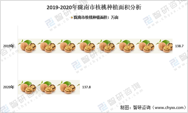 近年來,甘肅省隴南市核桃中指面積整體變化不大,2020年核桃播種面積137.8萬畝,同比減少0.9萬畝,下降0.64%。