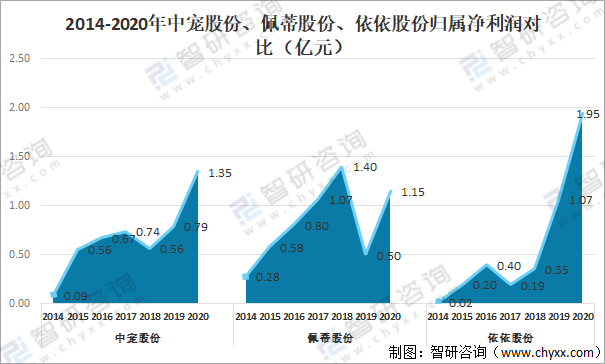 隨著營(yíng)業(yè)收入的增加,歸屬凈利潤(rùn)也隨之增長(zhǎng),2020年中寵股份歸屬凈利潤(rùn)達(dá)1.35億元,較2019年增加了0.56億元;佩蒂股份歸屬凈利潤(rùn)達(dá)1.15億元,較2019年增加了0.65億元;依依股份歸屬凈利潤(rùn)達(dá)1.95億元,較2019年增加了0.88億元。