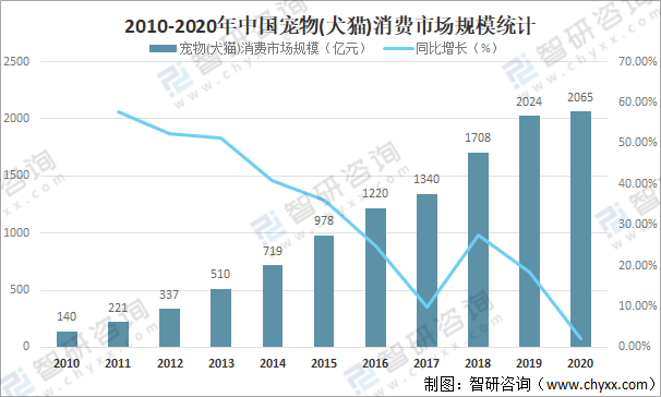 2010-2020年中國(guó)寵物(犬貓)消費(fèi)市場(chǎng)規(guī)模統(tǒng)計(jì)
