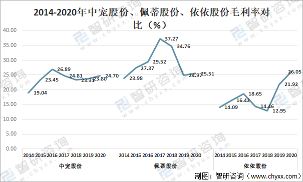 2014-2020年中寵股份、佩蒂股份、依依股份毛利率對(duì)比(%)