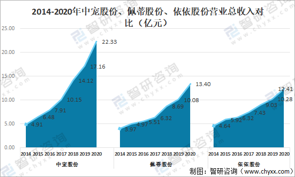 2014-2020年中寵股份、佩蒂股份、依依股份營(yíng)業(yè)總收入對(duì)比(億元)