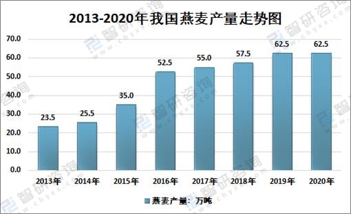燕麥是世界性栽培作物,但主要集中產(chǎn)區(qū)是北半球的溫帶地區(qū),主產(chǎn)國有俄羅斯、加拿大、美國、澳大利亞、英國、德國、芬蘭及中國等,USDA數(shù)據(jù)顯示2013年我國燕麥產(chǎn)量為23.5萬噸,2020年我國燕麥總產(chǎn)量增長至62.5萬噸。