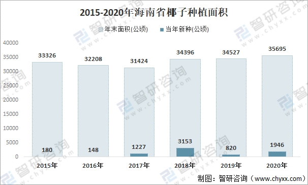 椰子樹是海南的特色樹種,是海南省重要的經濟作物之一。近幾年,海南省政府加強了對椰子產業的扶持力度,椰子種植面積不斷回升。2020年海南省椰子年末種植面積為35695公頃,其中當年新種1946公頃,較2019年增加了1126公頃。