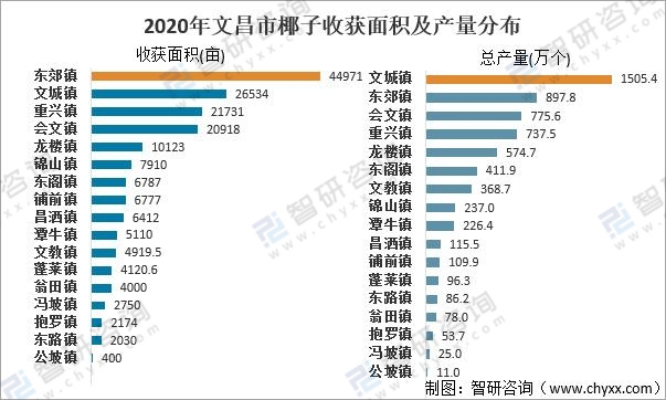 雖文城鎮椰子收獲面積居文昌市第二位,但單產較高,產量居全市首位,2020年文城鎮椰子收獲面積及產量分別為26534畝、1505.4萬個;東郊鎮椰子收獲面積及產量分別為44971畝、897.8萬個。