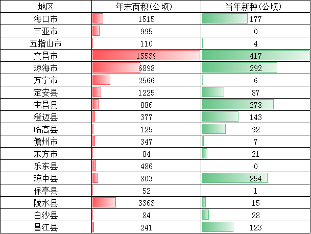 2020年文昌市椰子種植面積及新增面積均居海南省第一,種植面積為15539公頃,占全省的43.5%;當年新種面積為417公頃,占全省的21.4%。其次瓊海市椰子種植面積為6898公頃,當年新種面積為292公頃。