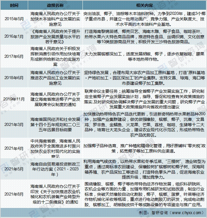 2015-2021年海南省椰子行業主要政策分析