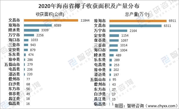 從收獲面積來看,2020年僅有文昌市椰子收獲面積超10000公頃,達11844公頃;其次為瓊海市,收獲面積為6089公頃;而從產量來看,僅有瓊海市、文昌市兩地產量超6000萬個,其中瓊海市產量居全省第一,達6911萬個;文昌市緊跟其后,產量為6311萬個。