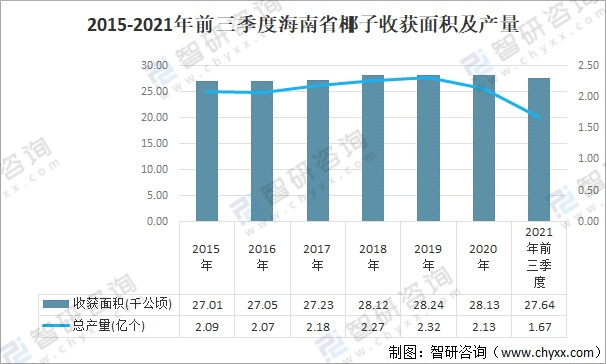 2020年海南省椰子產量為2.13億個,較2019年減少了0.19億個,主要受天氣干旱少雨影響。2021年前三季度海南省椰子產量為1.67億個,收獲面積為27.64千公頃。主推品種有文椰2號、文椰3號、文椰4號等。