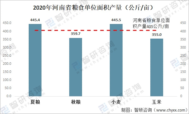 2020年河南省糧食單位面積產量為405公斤/畝,其中夏糧單位面積產量為445.4公斤/畝,小麥單位面積產量為445.5公斤/畝,均超糧食整體單位面積產量。