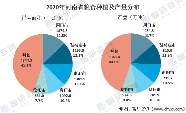 河南省糧食種植主要集中在周口市、駐馬店市、南陽市、商丘市、信陽市五個市區,2020年上述五市區種植面積占全省的54.9%,其中周口市占比12.8%、駐馬店市、南陽市均占比12.1%;五個市區糧食產量合計占比55.4%,其中周口市占比13.7%。