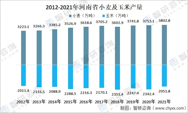 河南是我國冬小麥和夏玉米主產區,在2021年7•20洪災來臨之前,6月底前后河南小麥已經基本收獲完畢,因此產量受洪災影響較小,產量達3802.8萬噸,較2020年增加了49.7萬噸,占全國小麥總產量的28%;而玉米生長正處于關鍵時期,其次玉米屬于不耐澇的作物,因此產量受洪災影響較為嚴重,較2020年減少了290.7萬噸,占全國玉米總產量的7.5%。