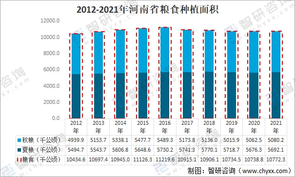河南省平原面積廣闊、土壤肥沃,歷來都是全國重要的農耕區。河南作為農業大省,特別是糧食生產對全國影響舉足輕重。根據河南省統計局數據:2021年河南省糧食種植面積為10772.3千公頃,其中夏糧種植面積為5692.1千公頃,秋糧種植面積為5080.2千公頃,較上年均有增長。