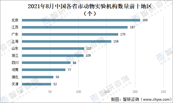 2021年8月北京市共有209家動(dòng)物實(shí)驗(yàn)機(jī)構(gòu),位居全國(guó)第一;江蘇省、廣東省分別以187家、170家排名第二、第三;其次動(dòng)物實(shí)驗(yàn)機(jī)構(gòu)數(shù)量為上海市158家。