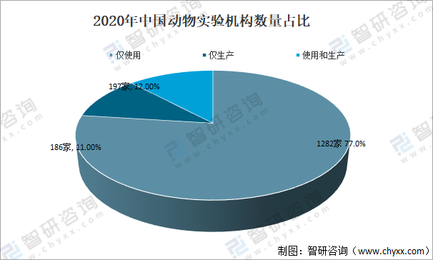 2020年中國(guó)動(dòng)物實(shí)驗(yàn)機(jī)構(gòu)數(shù)量達(dá)1665家,同比增長(zhǎng)4.52%。其中僅具有動(dòng)物使用資質(zhì)的機(jī)構(gòu)1282家,占比77%,僅具有動(dòng)物生產(chǎn)資質(zhì)的企業(yè)186家,占比11%,同時(shí)具有動(dòng)物使用和生產(chǎn)資質(zhì)的機(jī)構(gòu)197家,占比12%。