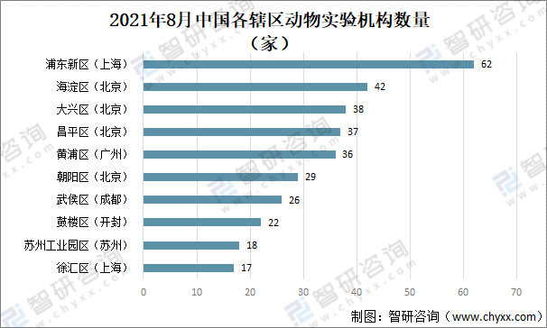 2021年8月中國(guó)各市轄區(qū)動(dòng)物實(shí)驗(yàn)機(jī)構(gòu)數(shù)量看,上海市浦東新區(qū)以62家動(dòng)物實(shí)驗(yàn)機(jī)構(gòu),位居榜首;北京市海淀區(qū)和大興區(qū)分別以42家和38家機(jī)構(gòu),排名二和三。