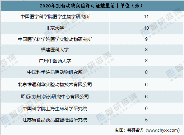 2020年擁有動(dòng)物實(shí)驗(yàn)許可證數(shù)量前十單位