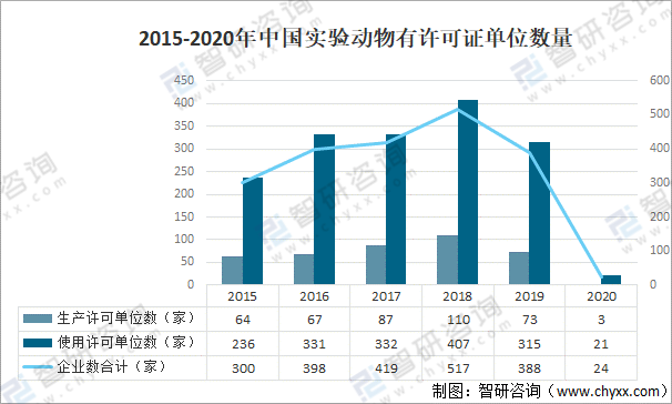實(shí)驗(yàn)動(dòng)物是指經(jīng)人工培育或人工改造,對(duì)其攜帶的微生物實(shí)行控制;遺傳背景明確,來(lái)源清楚,用于科學(xué)實(shí)驗(yàn)、藥品、生物制品的生產(chǎn)和檢定及其他科學(xué)實(shí)驗(yàn)的動(dòng)物。實(shí)驗(yàn)動(dòng)物環(huán)境生態(tài)學(xué)是研究實(shí)驗(yàn)動(dòng)物與外界環(huán)境相互關(guān)系的科學(xué)。2020年中國(guó)實(shí)驗(yàn)動(dòng)物有許可證企業(yè)為24家;其中,使用許可證單位數(shù)為21家;生產(chǎn)許可證單位數(shù)量為3家。