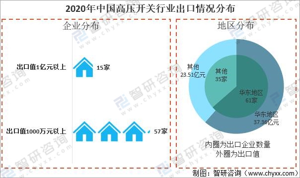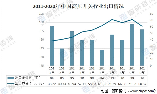 在全球大力發展清潔能源、建設智慧能源互聯網的背景下,作為關鍵設備之一的高壓開關在智能化、環保性、電壓等級提升及容量提升等方面發展迅速。2020年中國共96家企業實現高壓開關出口業務,出口值60.87億元。