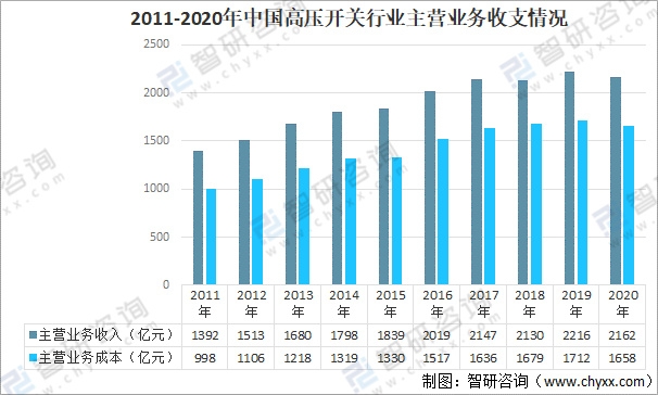 根據中國電器工業協會高壓開關分會數據:2020年中國高壓開關行業企業主營業務收入2162億元,較2019年同比減少2.4%;主營業務成本1658億元,較2019年同比減少32%。