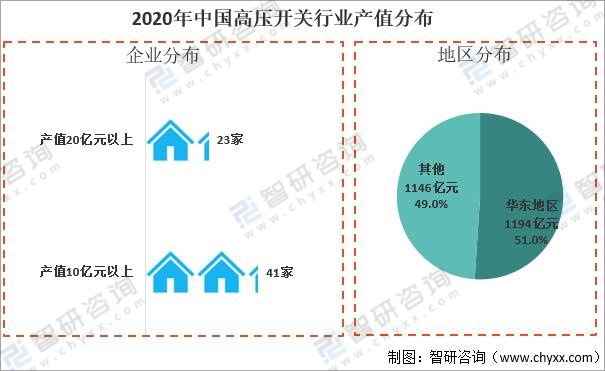 從地區分布來看,華東區產值最高,2020年華東區總產值為1194億元,占行業總產值的51.0%;從企業分布來看,2020年共有23家企業高壓開關產值在20億元以上,共有41家企業高壓開關產值在10億元以上。