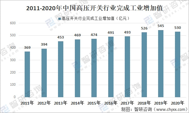 2011-2019年中國高壓開關行業增加值不斷增長,由2011年的369億元增加至2019年的545億元,年復合增長率為4.1%,2020年中國高壓開關行業完成工業增加值530億元,較2019年減少了15億元。