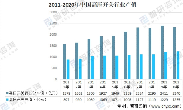 隨著我國經濟發展步入新常態,高壓開關行業從高速增長逐步轉為中低速增長。2020年中國高壓開關實現工業總產值2340億元,同比下降2.9%;其中實現高壓開關產值1255億元,同比增長2.1%。