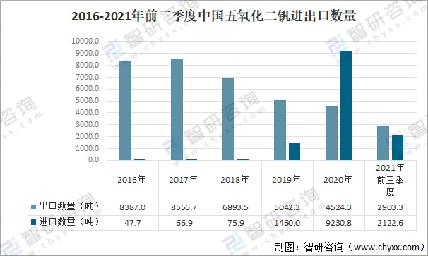 2016-2021年前三季度中國五氧化二釩進出口數量