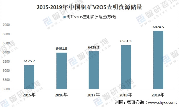 過去的幾十年來,工業對釩的需求量并不高,但是隨著鋼鐵行業的迅速發展,釩的市場需求遠超以往,工業對釩的主要 應用形式是五氧化二釩,五氧化二釩是一種金屬氧化物,分子式為V2O5,廣泛用于冶金、化工等行業,主要用于冶煉釩鐵。2019年中國釩礦V2O5查明資源儲量為6874.5萬噸。