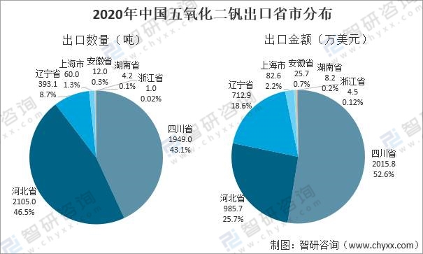 中國五氧化二釩出口集中在四川省、河北省兩地,主要由于國內釩企業主要分布在四川、河北等省份。2020年上述兩地出口數量合計占比達89.6%,其中四川省占比43.1%,河北省占比46.5%;出口金額合計占比78.3%,其中四川省占比52.6%,河北省占比25.7%。其余遼寧省、上海市、安徽省、湖南省、浙江省均有少量五氧化二釩出口。