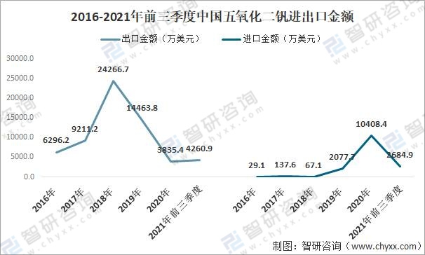 2016-2021年前三季度中國五氧化二釩進出口金額