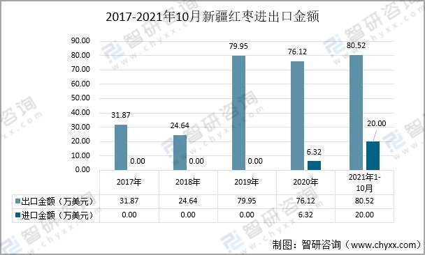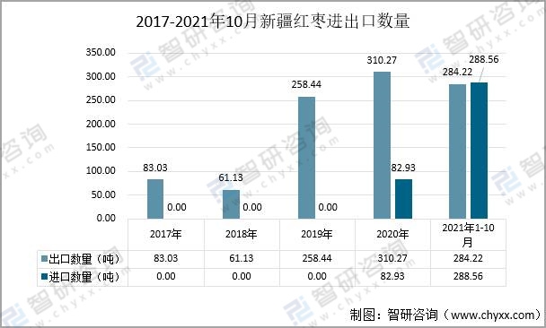 新疆紅棗近年來的進出口數量和金額也呈上升趨勢,2020年出口數量為310.27噸,相比2019年258.44噸增加了51.83噸,同比增長20.05%。2020年開始進口,進口數量為82.93噸。2021年1-10月期間的進出口相對持平。
