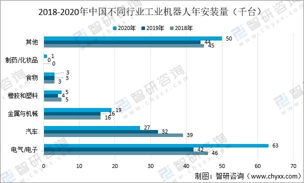 等方面。從分布情況看,電氣電子行業增長最快,2020年電氣電子的安裝量為63千臺,相比2019年的42千臺增長了50.00%。汽車行業下降了15.63%,金屬與機械行業增長了18.75%,橡膠和塑料行業增長了25.00%,食品行業基本不變。
